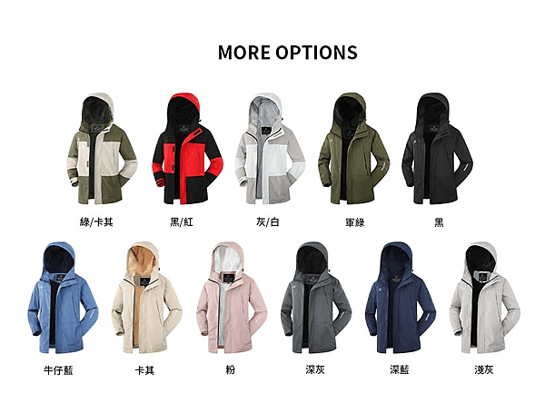 目前顏色有 綠/卡其、黑/紅、灰/白、軍綠、黑、牛仔藍、卡其、粉、深灰、深藍、淺灰